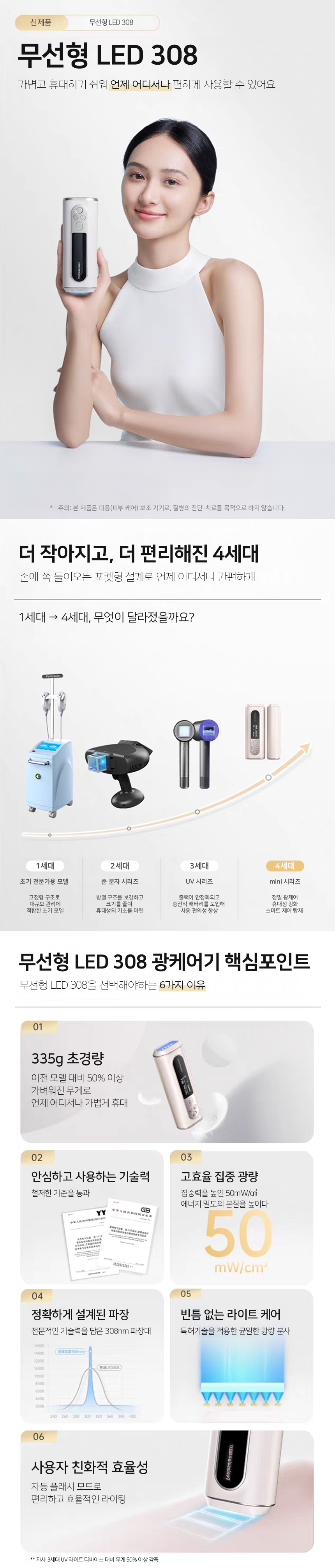 무선형 LED 308 광케어기는 더 작아지고, 더 가벼워진 4세대 휴대용 광케어 솔루션입니다.